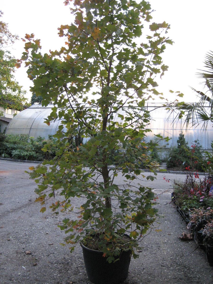 Mittelgrosser Baum bis ungefähr 1 m Höhe. Breite kugelförmige Krone. Dunkelgrünes gelapptes Laub. Im Herbst purpurrot und lange haftend. Blüte rot im April. Windempfindlich. Wächst schlecht auf kal...