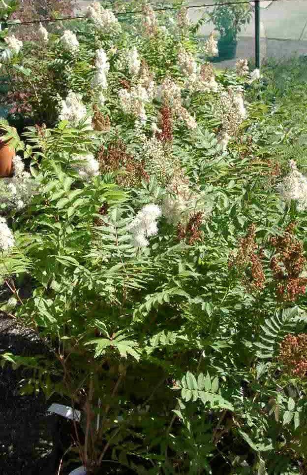 Sommergrüner, buschiger Strauch, der sich durch unterirdische Ausläufer vebreitet. Ca. 1 m hoch. Dekorativ zusammengesetztes Laub. Früh austreibend. Weiße Blütenrispen im Juni bis August. Sonnig bis halbschattig. Gedeiht auf allen frischen Gartenböden.